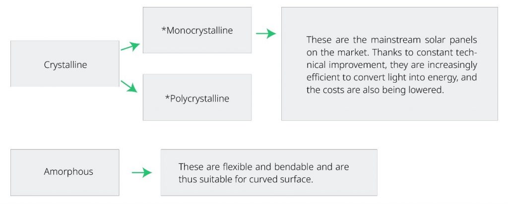 Solar panels are made of semiconductor material silicon to capture sunlight and convert it to electricity current. There are two main types of solar panels, crystalline and amorphous. Crystalline silicon (c-Si) solar panels are made of the crystalline forms of silicon. They have the highest energy conversion efficiencies and represent 95% of market share. Amorphous silicon (a-Si) solar panels are made of a thin layer of non-crystalline silicon. Despite low efficiency, they are flexible and bendable so are good candidates for curved surface in some unique solar projects.