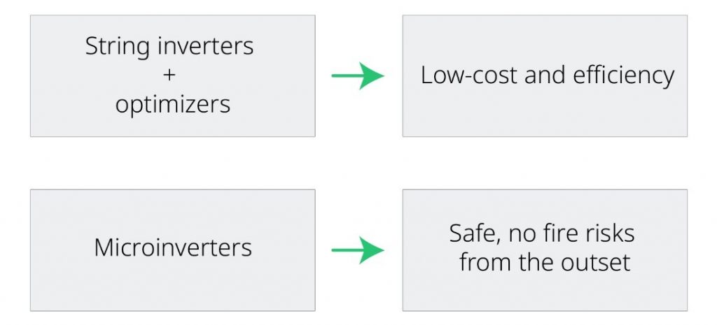 String inverters & power optimizers: String inverters are perhaps the most common type of solar inverters. They have a low cost point, but they may struggle to get optimal results because each PV string share one maximum power point. Therefore, power optimizers are often used in tandem with string inverters to transform the installation into a module-level system and reduce the DC voltage to a safety level.