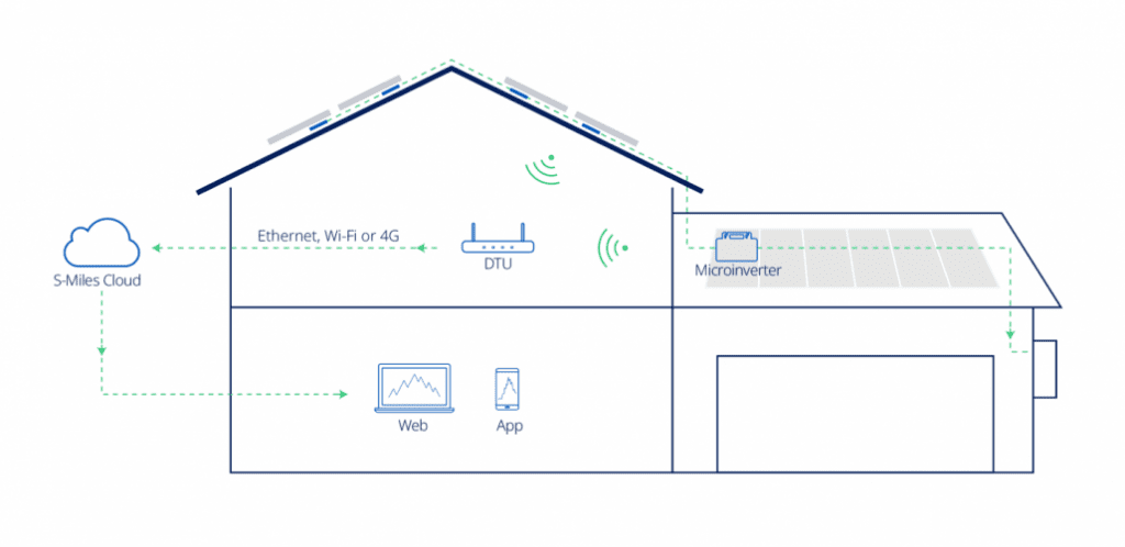 First, the DTU collects the information and data from your microinverters through 2.4G wireless communication. It then aggregates and sends that data to S-Miles Cloud via 4G, Wi-Fi, or a cable network.