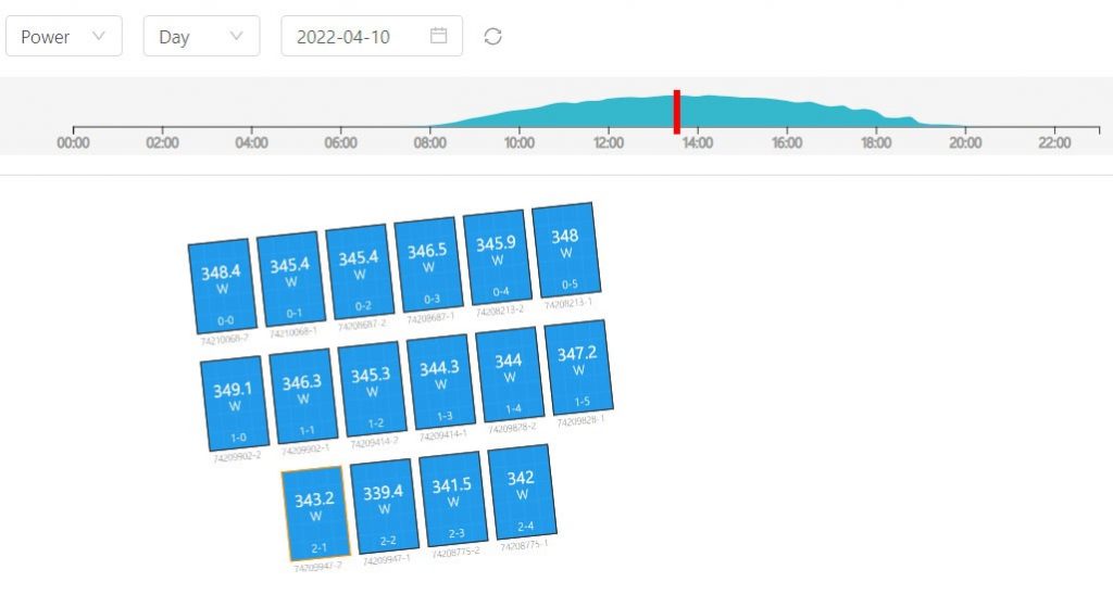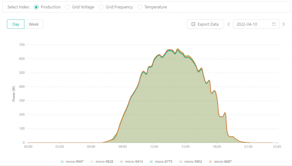 This includes detailed information on power levels over the course of the day, as seen above. Power production of each microinverter is closely tracked, which you can use to diagnose and optimize your solar system performance.