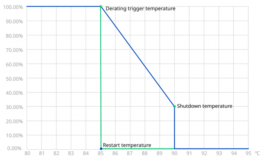 The graph below shows the power reduction relative to the temperature of these models of Hoymiles microinverters. As you can see, power drops rapidly once the internal temperature of the microinverter rises past 90°C.