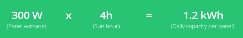 In this example, each individual panel can generate 1,200 watt-hours (1.2 kWh) per day. This is because we take the wattage (300 watts) and multiply it by four (the number of sunshine hours). This gives us 1,200 watt-hours in total, or more simply 1.2 kWh.