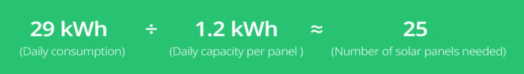 You then take the amount of energy your home or business consumes per day, in this case, 29 kWh, and divide this by the number of kWh each panel can produce. In this case, our calculation is 29 / 1.2. This gives us 24.166. Obviously, you can’t install 0.166th of a panel, so we’ll round up to 25 to be safe, and that’s the number of solar panels we would need in theory in the above solar installation to meet the daily energy demand of 29 kWh.