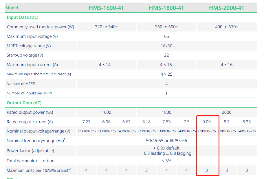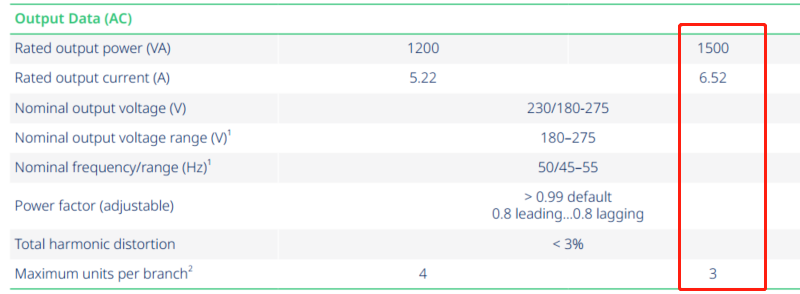 Our user manual states that the output current of our AC terminal is 25A, the rated output current is 6.52A, and there are three microinverters allowed in a single branch.