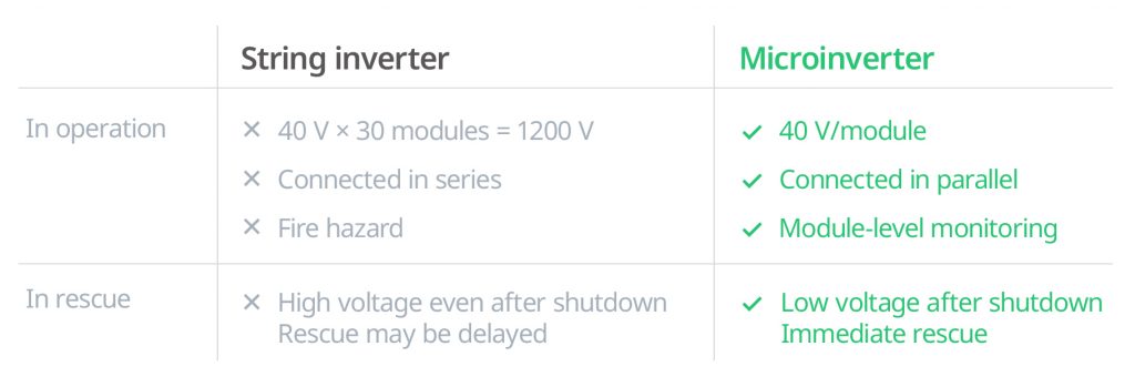 By contrast, microinverters are connected in parallel and each only carries a voltage of 40 V, significantly downgrading the safety risk in the first place.