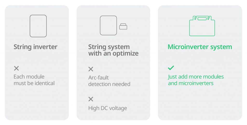 By contrast, boosting the capacity of a microinverter system is straightforward. You simply add more modules and microinverters.
