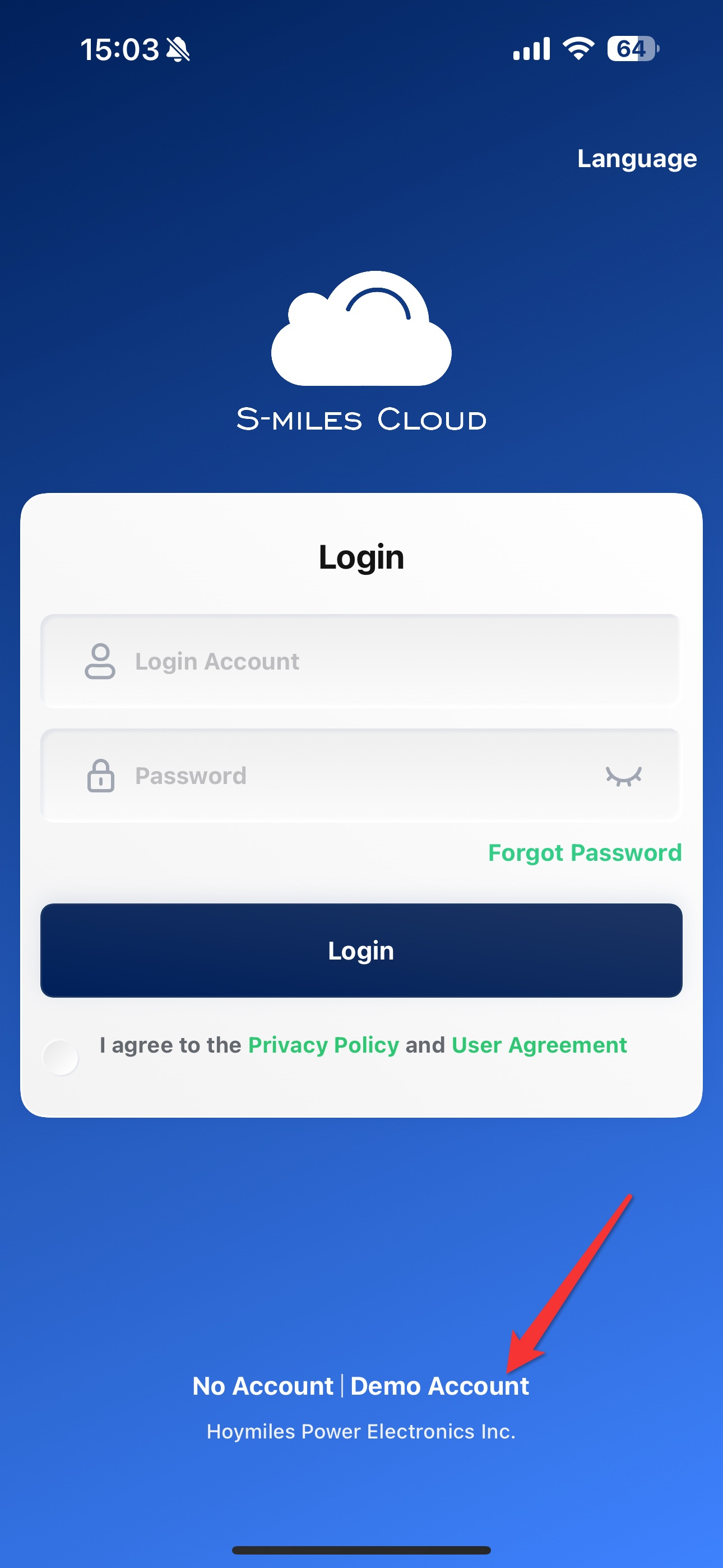 ในการเข้าถึงแพลตฟอร์มการเฝ้าตรวจสอบของ S-Miles Cloud คุณจะต้องมีบัญชีที่สร้างโดยผู้ติดตั้งหรือตัวแทนจำหน่ายของคุณ ผู้ติดตั้งหรือตัวแทนจำหน่ายจะให้ข้อมูลประจำตัวที่จำเป็นแก่คุณในการเข้าสู่ระบบ เมื่อคุณมีข้อมูลประจำตัวแล้ว คุณจะสามารถเข้าสู่ของแพลตฟอร์มเพื่อทำการเฝ้าตรวจสอบการทำงานให้กับระบบของคุณได้ หากคุณพบปัญหาใด ๆ คุณสามารถติดต่อฝ่ายสนับสนุนด้านเทคนิคของ Hoymiles เพื่อรับความช่วยเหลือได้.